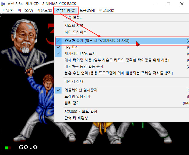 | 실행기(에뮬레이터)는 및 설명은 아래 클릭 이동후 받으실수 있습니다. Kega Fusion v3.64 한글판 eagleforce.tistory.com/2373 3 닌자 킥 백 3 Ninjas Kick Back 북미판 / 1994 / 액션 Core Design, Malibu Interactive kega Fusion 에서 처음 구동 되다가 멈춤현상있으면 아래와 화면과 같이 선택사항 > 완벽한 동기 (일부 세가/메가시대에 사용) 를 체크해 주시고 TAB 키를 눌러 제부팅 해주면 정상 구동 됩니다. ![]() |