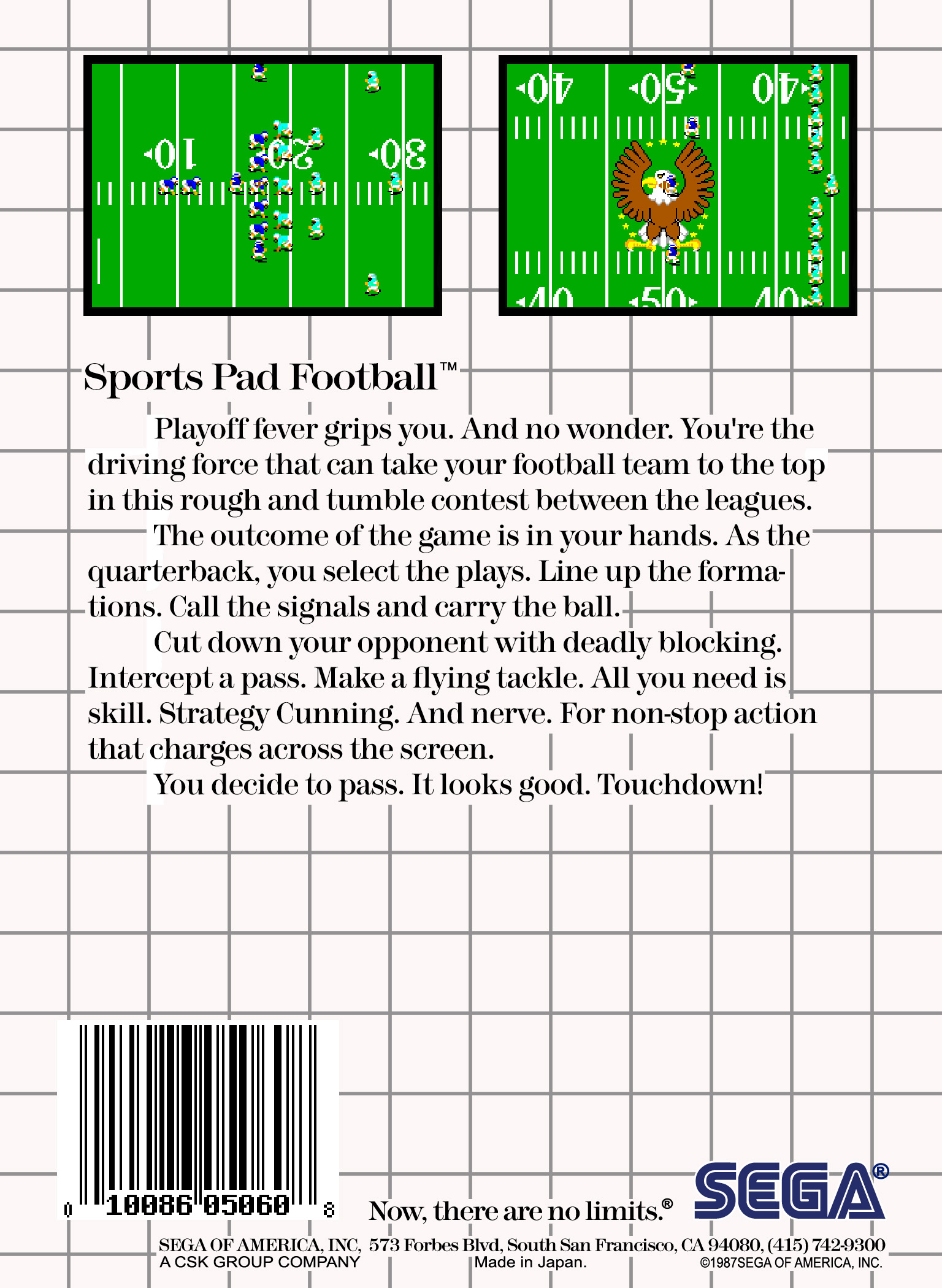 | 실행기(에뮬레이터) 다운로드및 설명은 아래를 클릭해 주세요. Kega Fusion v3.64 한글판 eagleforce.tistory.com/2373 BizHawk v2.6 (멀티 에뮬레이터) eagleforce.tistory.com/2635 스포츠 패드 풋볼 / 그레이트 풋볼 グレートフットボール Sports Pad Football / Great Football 1987 / 스포츠 SEGA |