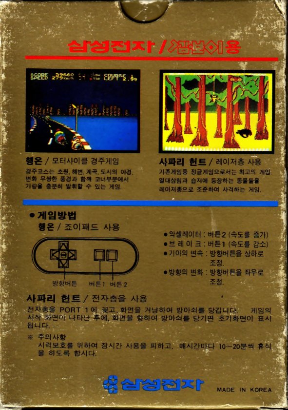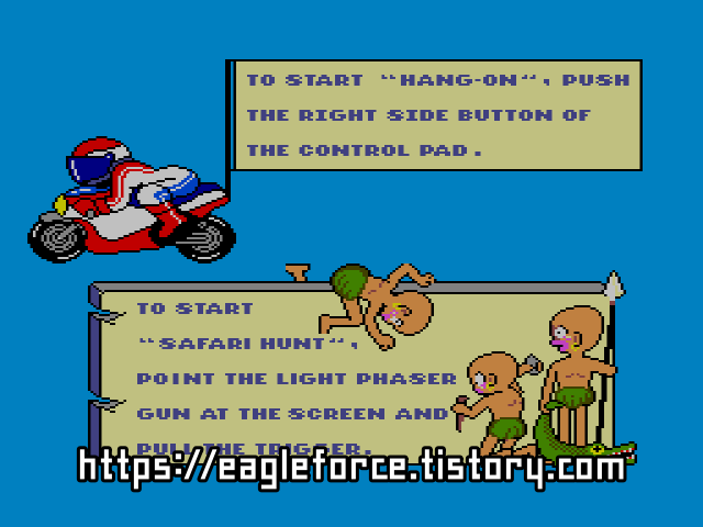 | 실행기(에뮬레이터) 다운로드및 설명은 아래를 클릭해 주세요. Kega Fusion v3.64 한글판 eagleforce.tistory.com/2373 BizHawk v2.6 (멀티 에뮬레이터) eagleforce.tistory.com/2635 행온 & 사파리 헌트 Hang-On & Safari Hunt 1986 / 레이싱, 건 슈팅 |