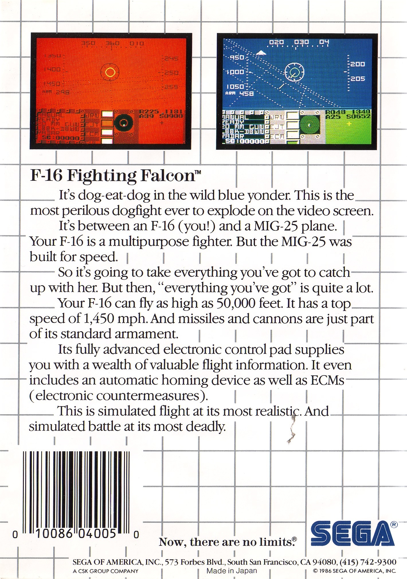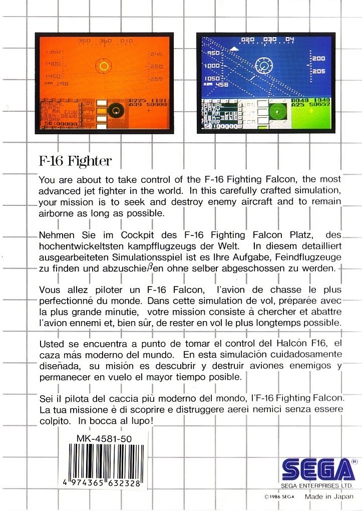 | 실행기(에뮬레이터) 다운로드및 설명은 아래를 클릭해 주세요. Kega Fusion v3.64 한글판 eagleforce.tistory.com/2373 BizHawk v2.6 (멀티 에뮬레이터) eagleforce.tistory.com/2635 F-16 파이팅 팔콘 / F-16 파이터 F-16 Fighting Falcon 1985 / 시뮬레이션, 슈팅 SEGA |
