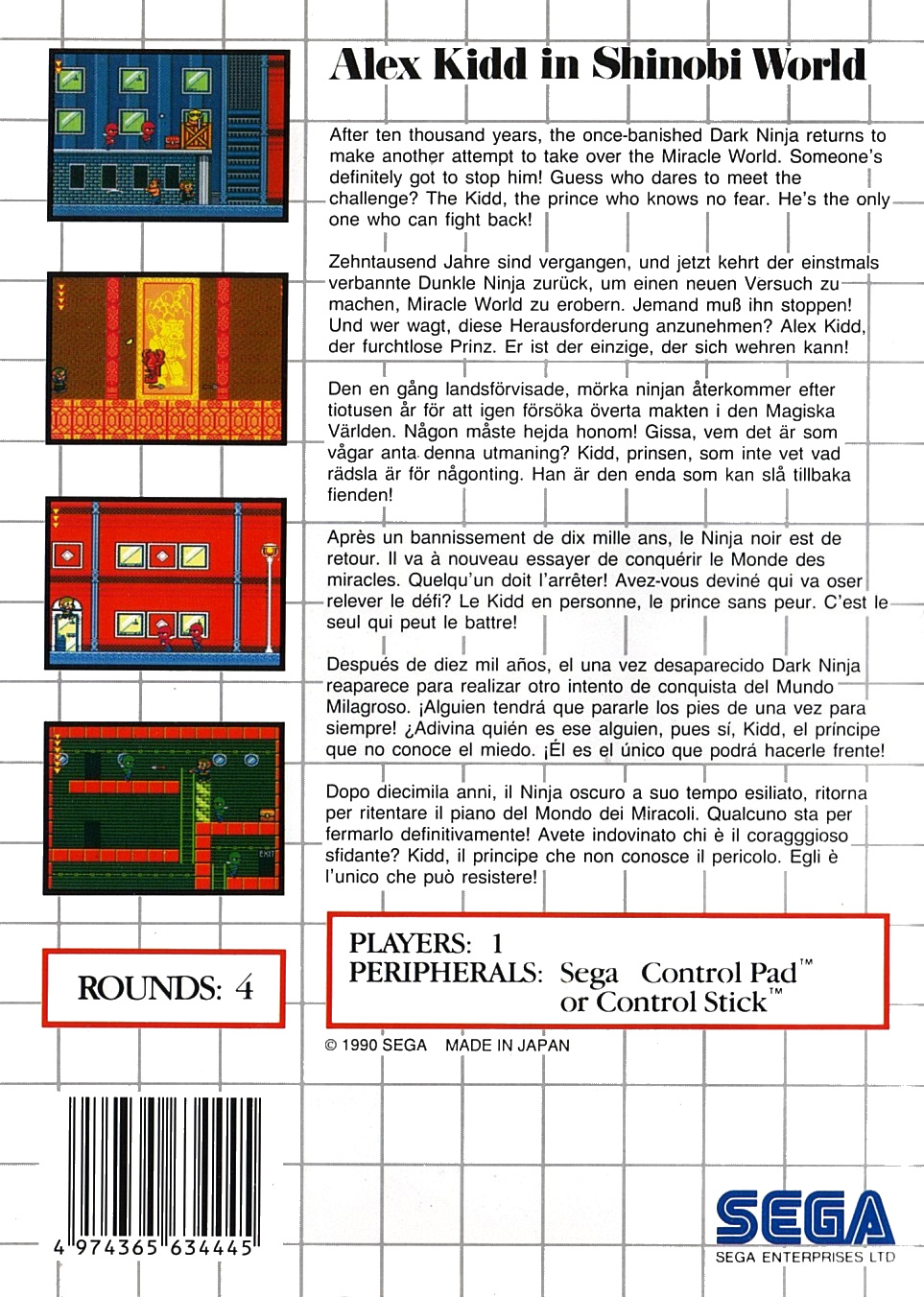 | 실행기(에뮬레이터) 다운로드및 설명은 아래를 클릭해 주세요. Kega Fusion v3.64 한글판 eagleforce.tistory.com/2373 BizHawk v2.6 (멀티 에뮬레이터) eagleforce.tistory.com/2635 알렉스 키드 인 시노비 월드 Alex Kidd in Shinobi World 1990 / 액션 SEGA |