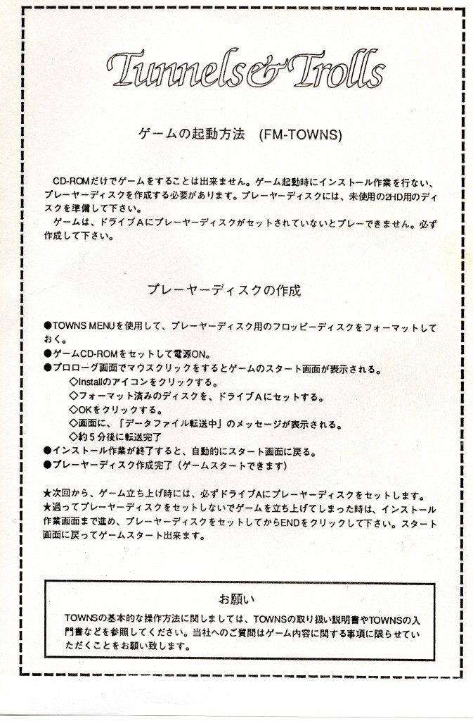 [FM-Towns] 터널즈 앤 트롤즈 / トンネルズ & トロールズ / Tunnels and Trolls: Crusaders of Khazan / 일본판