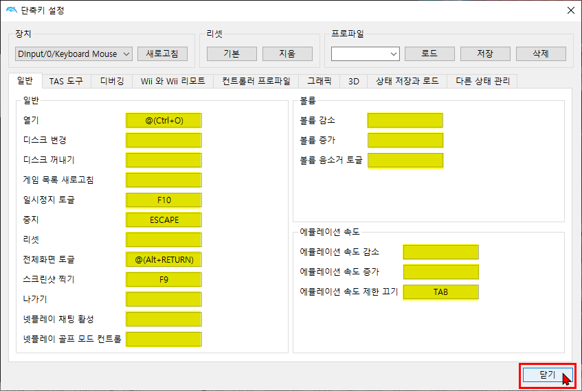 | 기본 단축키 일시정지 : F10 게임 종료 : ESC 스크린샷 : F9 프레임 속도 제한 해제 : TAB 게임상태 저장 : 쉬프트 + F1 ~ 쉬프트 + F8 게임상태 로드 : F1 ~ F8 단축키 사용자 설정 실행기 메뉴에서 옵션 > 단축키 설정을 클릭 합니다. ![]() 아래 노란색 부분 클릭후 사용자에 맞춰 대응키를 눌러 주고 설정 완료후 닫기 버튼을 클릭 합니다. ![]() |